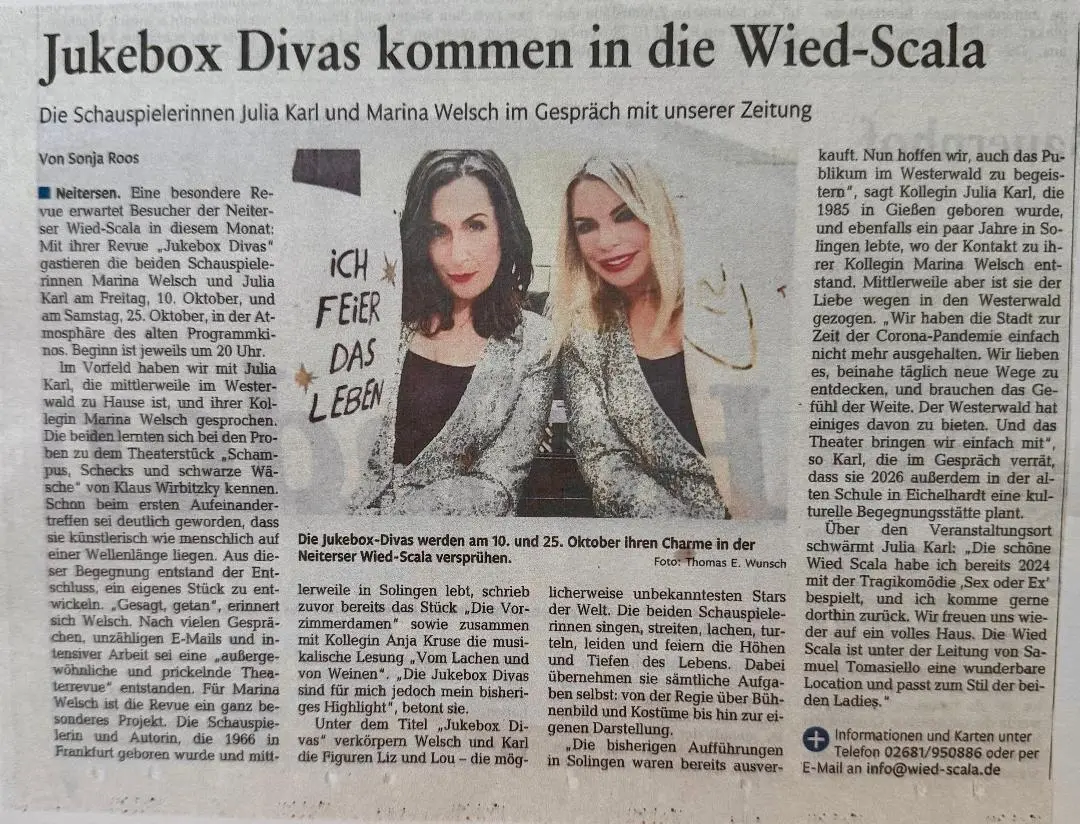 Die Solinger Aktrice Marina Welsch, die ihre Partnerin mehr zufällig kennengelernt hatte, übernahm auch die Regie. Sie kommentierte den Erfolg des mit großem Beifall honorierten Theaterstücks nach der Vorführung: „Ich freue mich über die gute Resonanz nach vier Jahren Pause, schließlich habe ich vor zehn Jahren bei der Eröffnung des Kammerspielchens beim ersten Stück mitgespielt und damit eine besondere Beziehung zu dem kleinen Theater.“